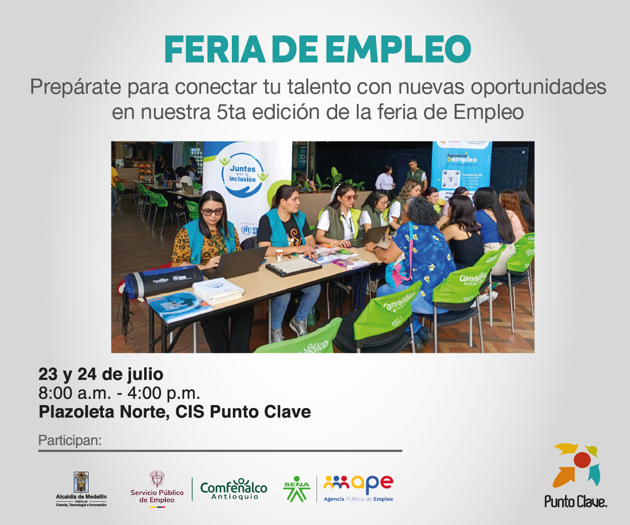 Prepárate para conectar tu talento con nuevas oportunidades en nuestra 5ta edición de la Feria de Empleo. 📍 Plazoleta Norte, Centro Integral de Servicios Punto Clave Miércoles 23 y jueves 24 de julio. ¡Estamos listos para conectar tu talento con nuevas oportunidades!