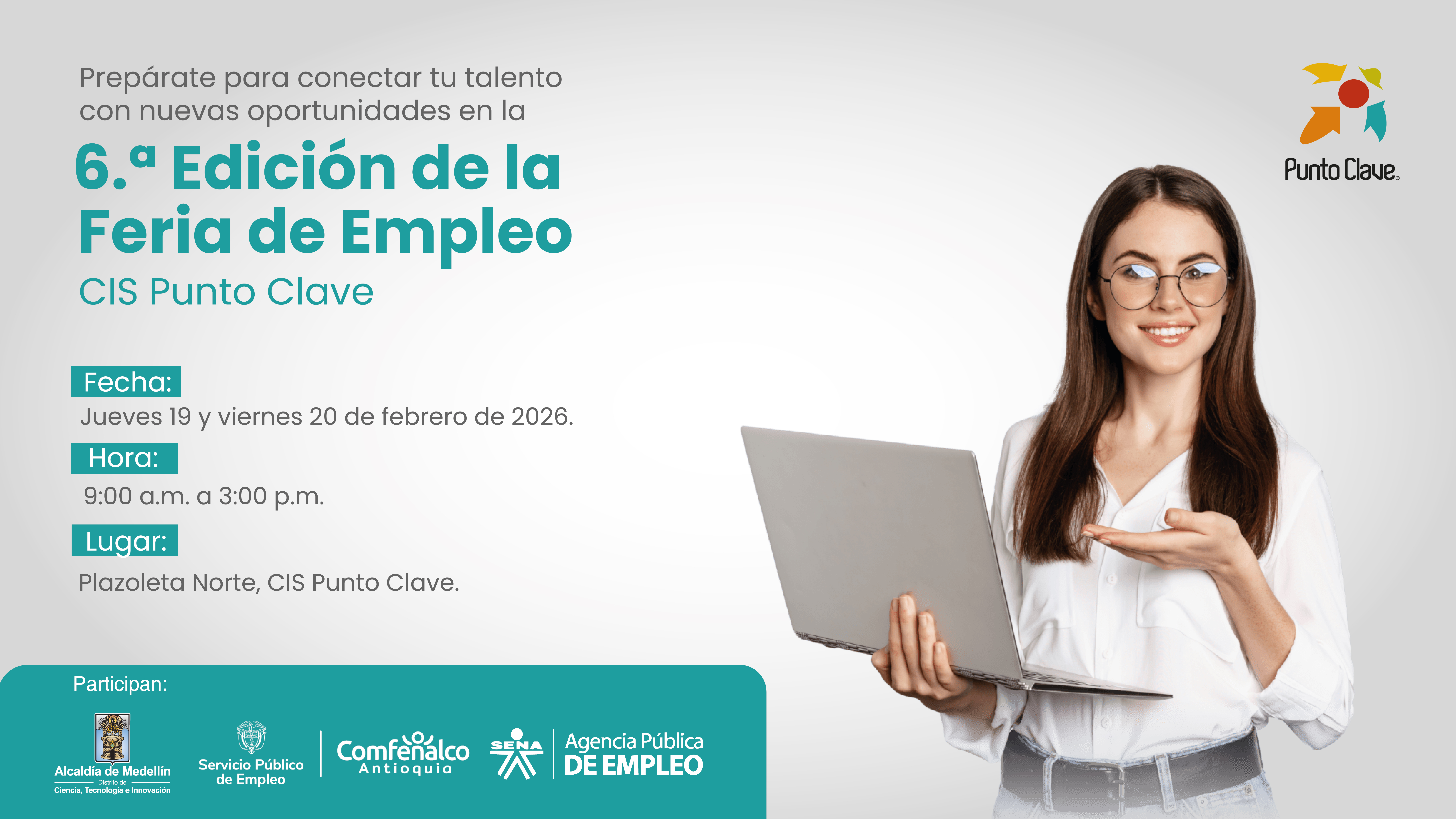 Prepárate para conectar tu talento con nuevas oportunidades en la 6° edición de la feria de empleo. Fecha: jueves 19 y viernes 20 de febrero de 2026 Hora: 9:00 a.m. - 3:00 p.m. Lugar: Plazoleta Norte, CIS Punto Clave